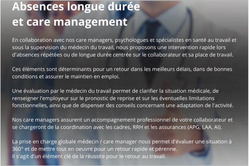 En collaboration avec nos care managers, psychologues et spécialistes en santé au travail, nous proposons des suivis personnalisés à la fois à l'écoute du collaborateur, de l'entreprise et de l'assurance afin de favoriser un retour rapide et dans les meilleures conditions.